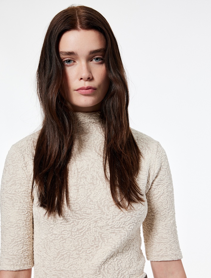 Koton X Şahika Ercümen - Slim Fit Dirsek Boy Kısa Kollu Dik Yaka Dokulu Tişört Sepete Ekle