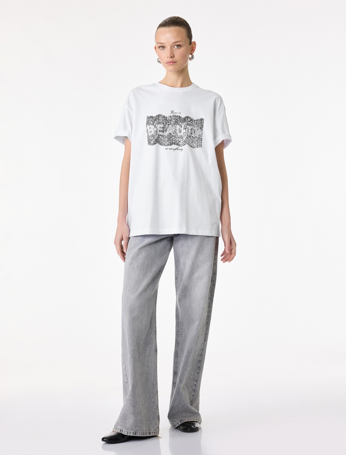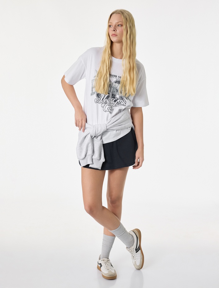Kısa Kollu Bisiklet Yaka Pamuklu Oversize Baskılı Tişört Sepete Ekle