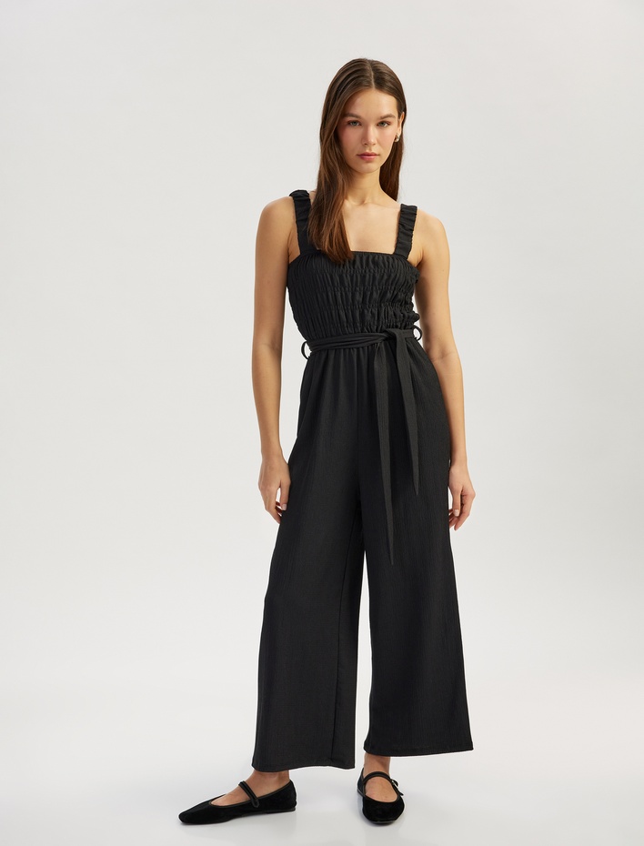 Gipeli Kare Yaka Kolsuz Beli Kuşaklı Geniş Paça Tulum Bürümcük