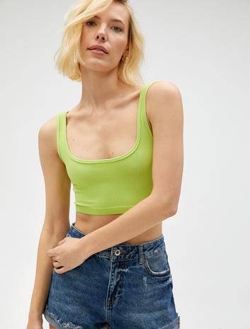 Kısa Kollu U Yaka Kaşkorse Viskon Kumaş Crop Tişört
