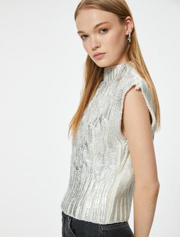 Kolsuz Süveter Dik Yaka Metalik Örgü Dokulu Slim Fit