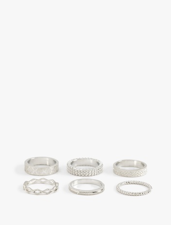 Bu sezon farklı şekillerdeki yüzük modelleri aynı kombinlerde biraraya geliyor, gümüş yüzük ve altın yüzük tonları birlikte kullanılıyor. Başparmağı ve küçük parmaklarda kullanılan yüzük modelleri büyük manşet bilekliklerle şık kombinler yaratıyor. Koton aksesuar koleksiyonu içerisinde yer alan yüzük tasarımları tekli ve çoklu paketlerle sunuluyor.