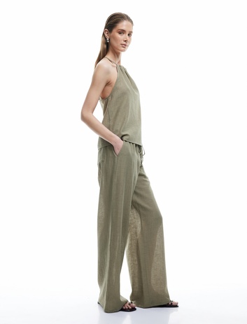 Dökümlü Keten Karışımlı Bol Paça Müslin Pantolon