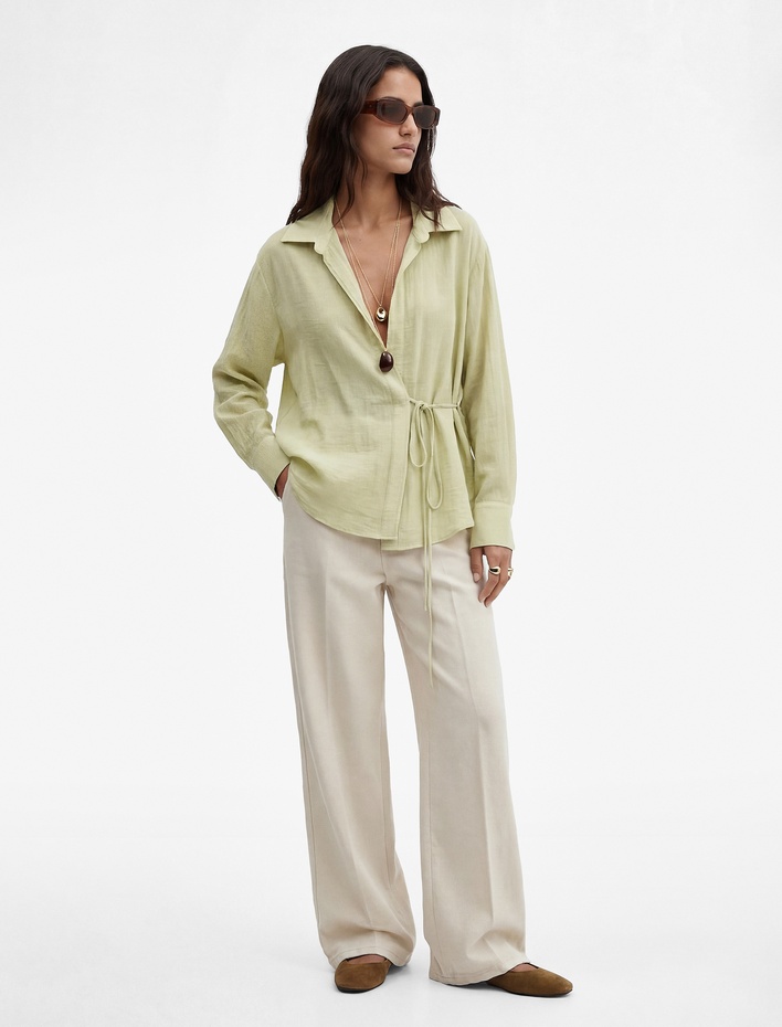 Aerobin Kumaş Önden Bağlama Detaylı Klasik Yaka Uzun Kollu Gömlek