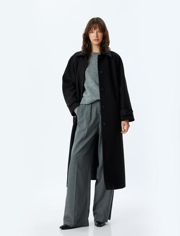 Düğmeli Cepli Kuşak Detaylı Ekstra Uzun Kaşe Kaban