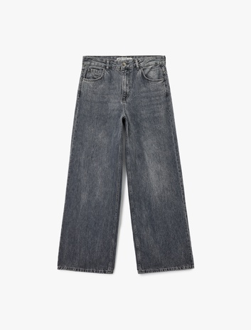 Pamuklu Kemer Detaylı Cepli Düğmeli Geniş Paça Jean Pantolon - Wide Leg Jeans