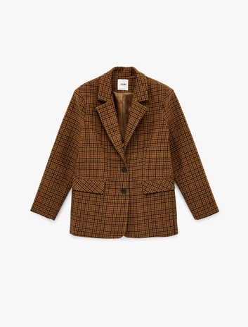 Cep Detaylı Geniş Yaka Düğmeli Uzun Kollu Ekoseli Blazer Ceket