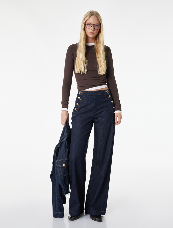 Düğme Detaylı Cepli Geniş Paça Denim Pantolon -  Wide Leg Jeans Sepete Ekle