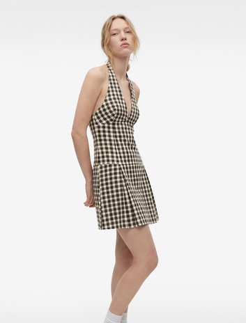 Kolsuz Pileli Mini Ekoseli Halter Yaka Elbise