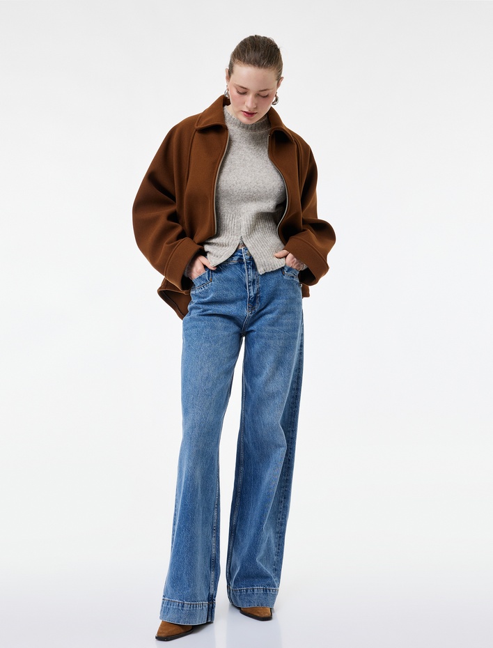 Regular Fit Uzun Kollu Fermuarlı Dik Yaka Kaşe Ceket