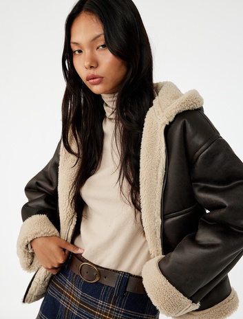 Koton X Zeynep Bastık - Suni Deri Crop Oversize Biker Ceket Yakası Peluş Detaylı Sepete Ekle