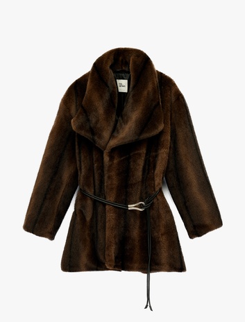 Kemer Detaylı Kruvaze Yaka Uzun Kollu Suni Kürk Kaban