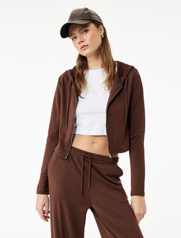 Kapüşonlu Fermuarlı Uzun Kollu Modal Karışımlı Crop Sweatshirt