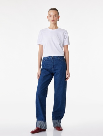 Pamuklu Kısa Kollu Bisiklet Yaka Kabartma Baskı Detaylı Tişört Sepete Ekle
