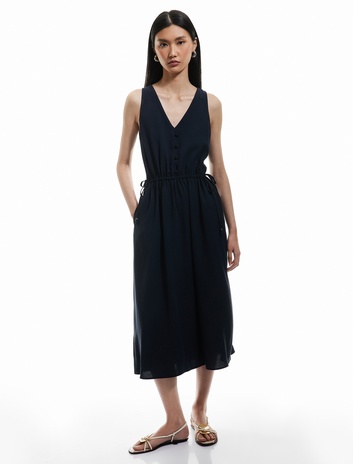 Viskon Keten Karışımlı Cepli Kolsuz V Yaka Midi Boy Elbise