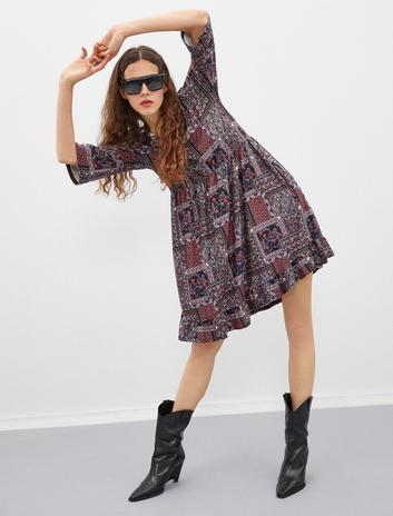 Şal Desenli Elbise 3/4 Kol Mini