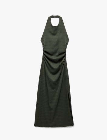 Kolsuz Drapeli Sırt Detaylı Midi Boy Halter Yaka Elbise