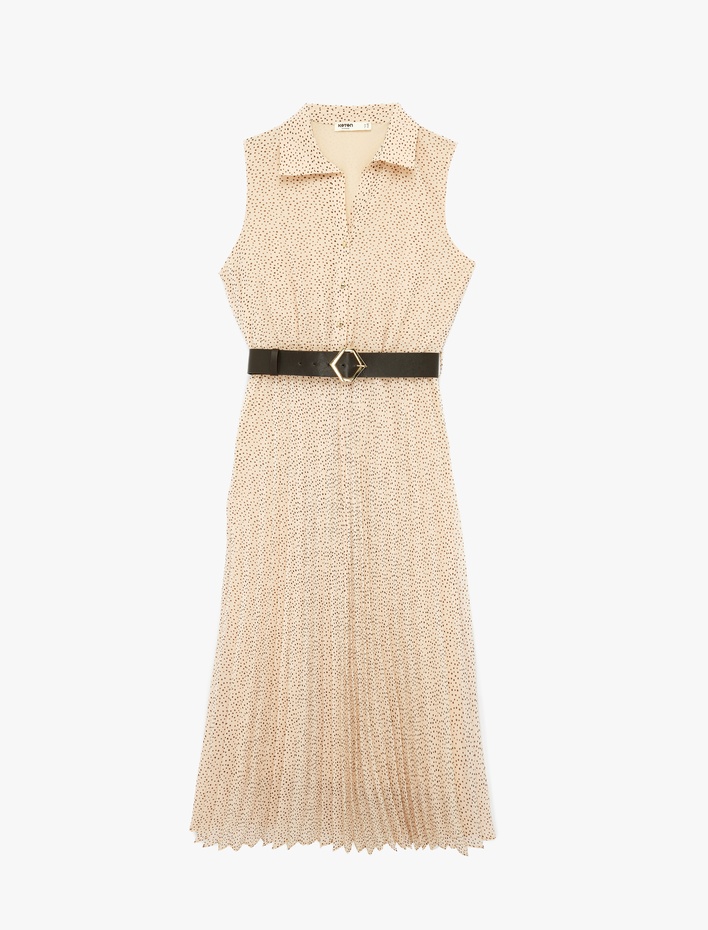 Şifon Kolsuz Kemerli Midi Puantiyeli Pileli Gömlek Elbise Sepete Ekle