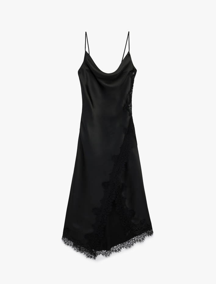 Asimetrik Kesim İp Askılı Dantel Detaylı Degaje Yaka Uzun Saten Elbise Sepete Ekle