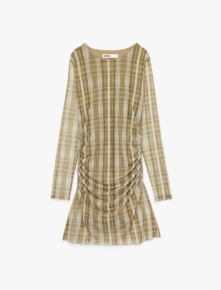 Slim Fit Uzun Kollu Yuvarlak Yaka Drapeli Detaylı Mini Ekose Tül Elbise Sepete Ekle