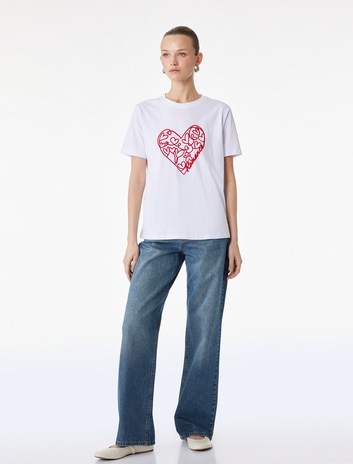 Pamuklu Kısa Kollu Bisiklet Yaka Kalpli Tişört Sepete Ekle