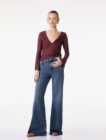 Slim Fit Uzun İspanyol Kollu V Yaka Dantel Tişört
