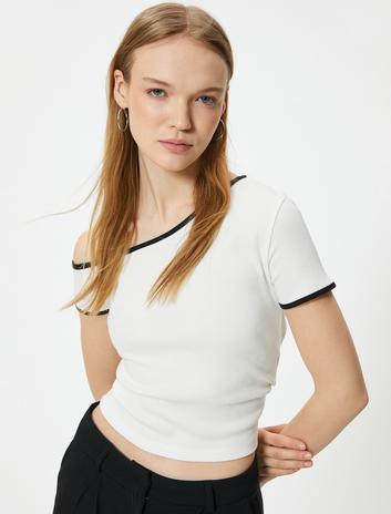 Kayık Yaka Tişört Biyeli Düşük Omuzlu Kısa Kollu Slim Fit