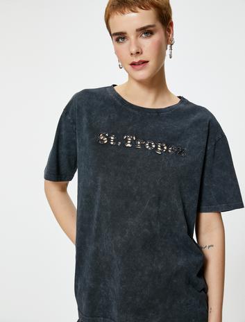 Taş Detaylı Bisiklet Yaka Yıkamalı Tişört