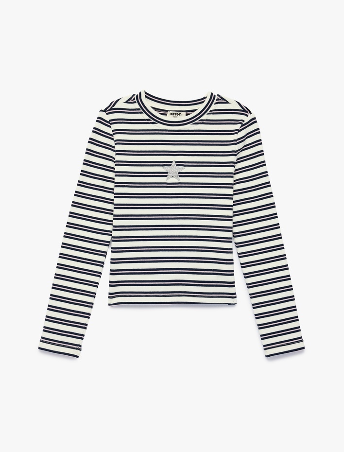 Pamuklu Uzun Kollu Bisiklet Yaka Nakış Detaylı Çizgili Tişört Sepete Ekle