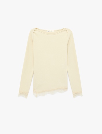 Dantel Detaylı Asimetrik Kesim Kayık Yaka Uzun Kollu Tişört Sepete Ekle
