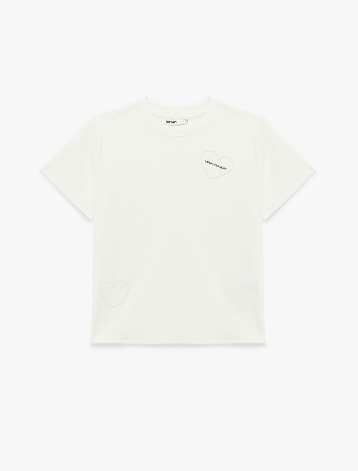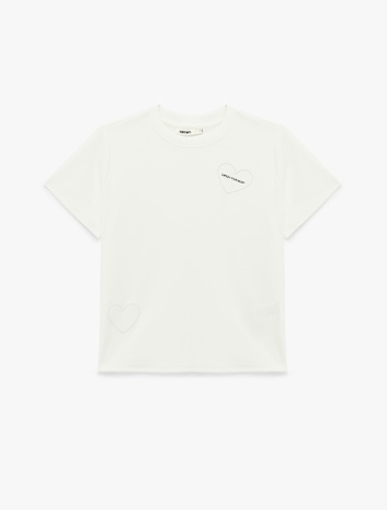 Pamuklu Kısa Kollu Bisiklet Yaka Nakış Detaylı Kalpli Tişört Sepete Ekle