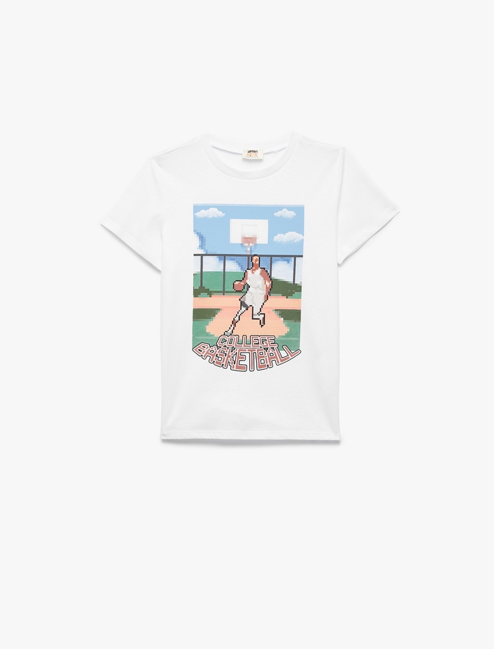 Pamuklu Kısa Kollu Bisiklet Yaka Basketbol Temalı Baskılı Tişört Sepete Ekle