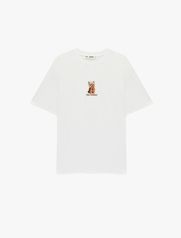 Kısa Kollu Bisiklet Yaka Köpek Nakışlı Pamuklu Oversize Tişört Sepete Ekle