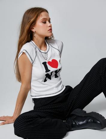 NY Baskılı Tişört Baskılı Kısa Kollu Bisiklet Yaka Pamuklu