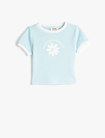 Kız Çocuk Tişört Kısa Kollu Bisiklet Yaka Ribanalı Çiçek Baskılı Pamuklu