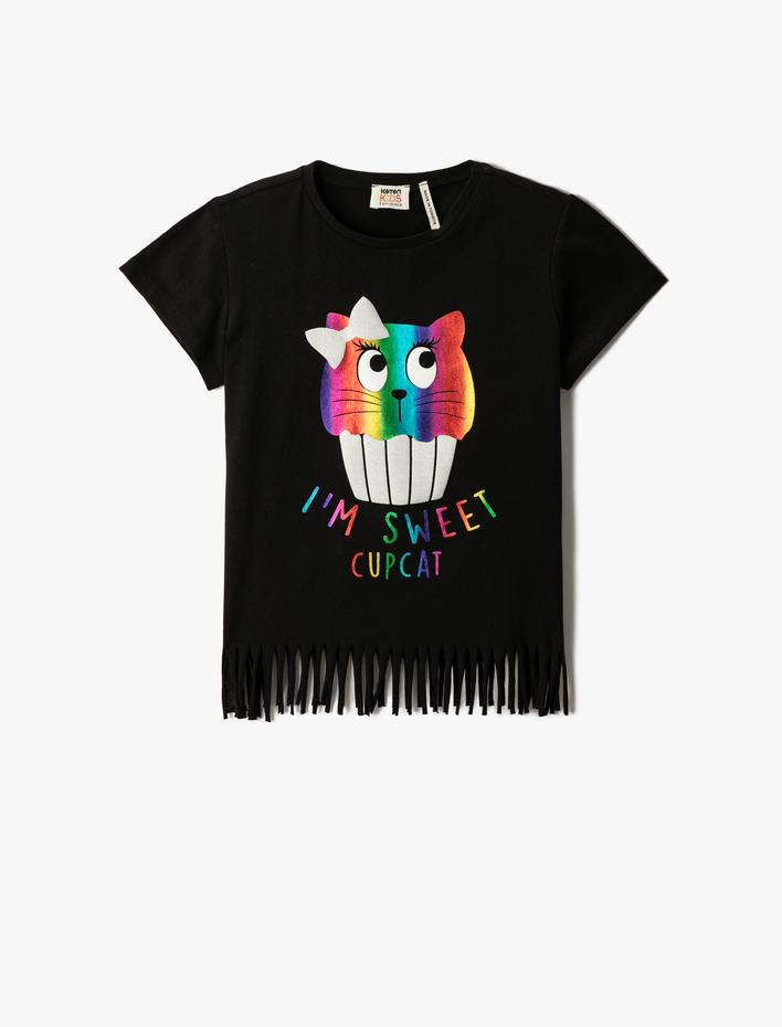 Kedi Baskılı Kısa Kollu Tişört Püsküllü Bisiklet Yaka Pamuklu Sepete Ekle