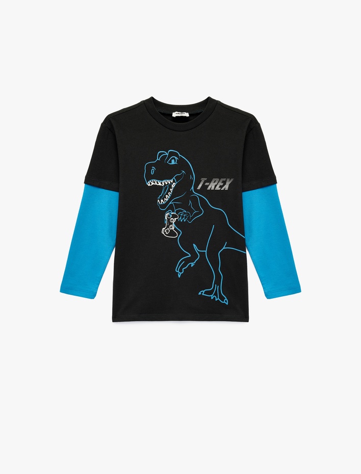 Uzun Çıkma Kollu Bisiklet Yaka Pamuklu Dinozor Baskılı Tişört Sepete Ekle