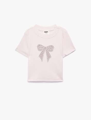 Pamuklu Taş Detaylı Kısa Kollu Bisiklet Yaka Fiyonk Baskılı Tişört Sepete Ekle
