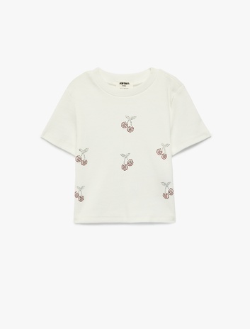 Kısa Kollu Bisiklet Yaka Kiraz Baskılı Taş Detaylı Pamuklu Tişört Sepete Ekle