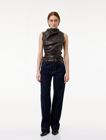 Slim Fit Drapeli Yuvarlak Hafif Dik Yaka Kolsuz Suni Deri Bluz Sepete Ekle
