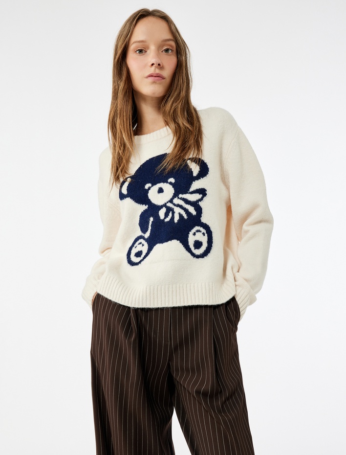 Ayıcık İşlemeli Uzun Kollu Bisiklet Yaka Triko Kazak Sepete Ekle