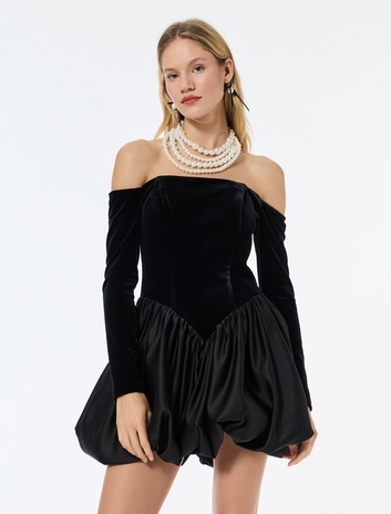 Omzu Açık Uzun Kollu Kadife Mini Balon Elbise Sepete Ekle