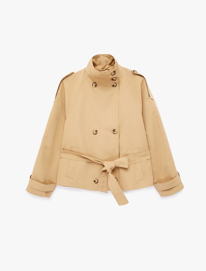 Cepli Kemerli Düğmeli Dik Yaka Uzun Kollu Gabardin Ceket Sepete Ekle