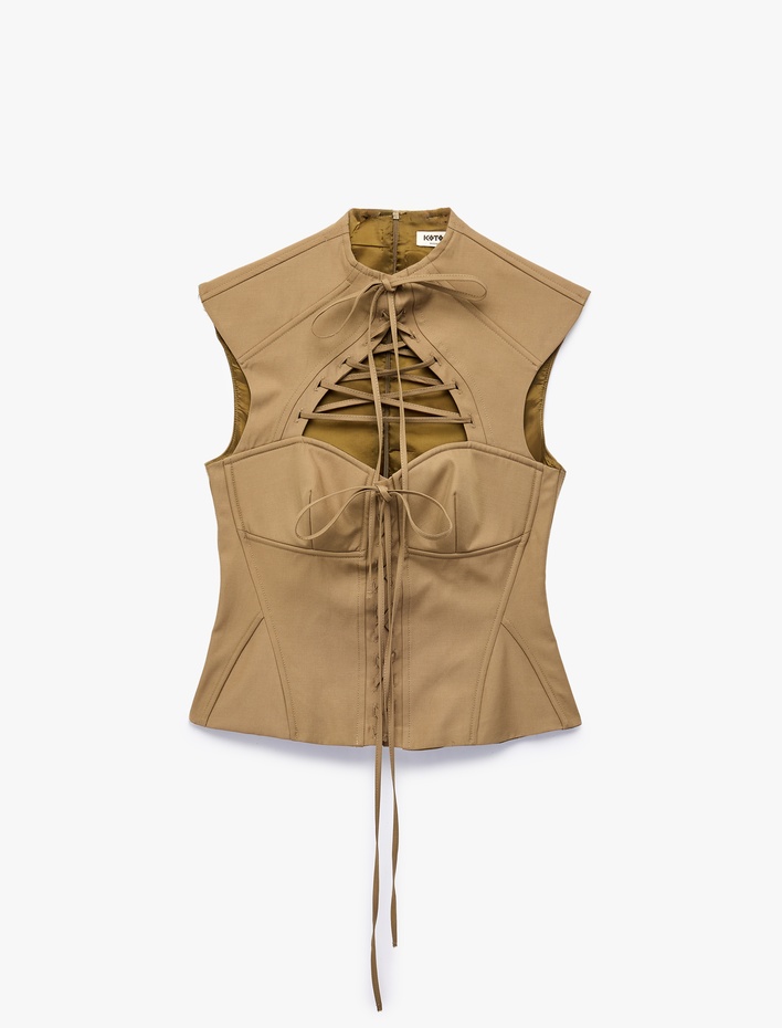 Slim Fit Dik Yaka Fermuarlı Bağcıklı Pencere Detaylı Kolsuz Bluz