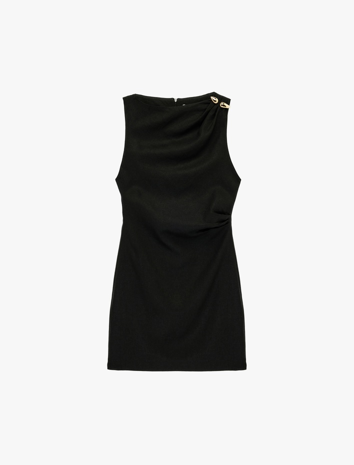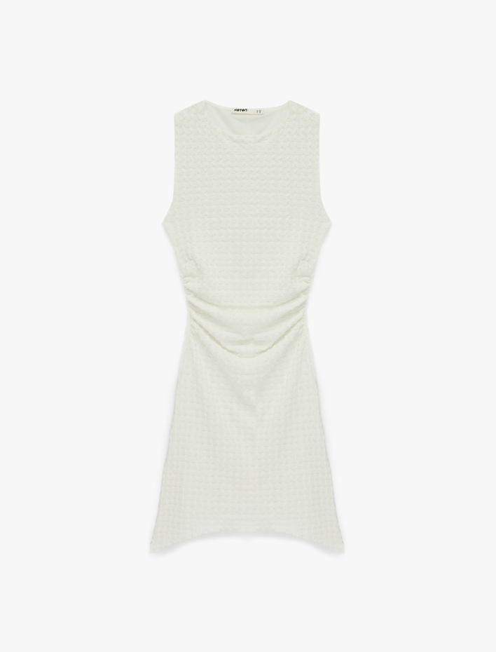 Bürümcük Kumaş Slim Fit Drapeli Asimetrik Kesim Bisiklet Yaka Kolsuz Mini Elbise Sepete Ekle