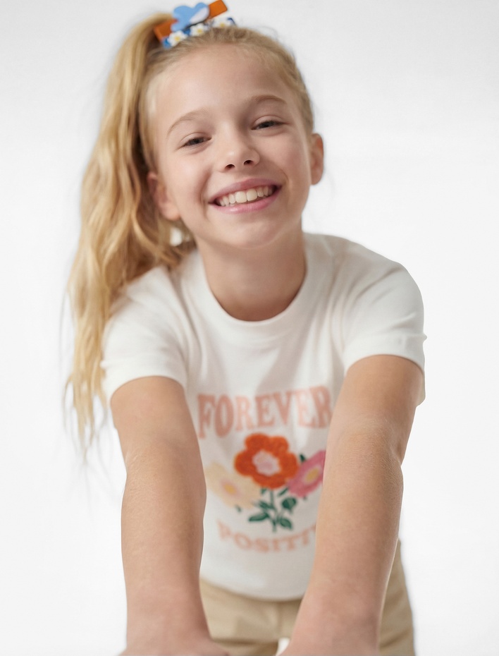 Kız Çocuk Pamuklu Kısa Kollu Bisiklet Yaka Baskılı Tişört