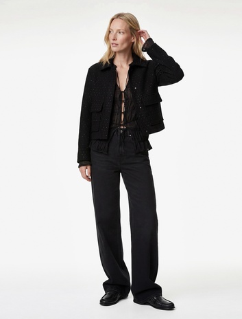 Uzun Kollu Fermuarlı Parıltılı Taş Detaylı Kısa Ceket