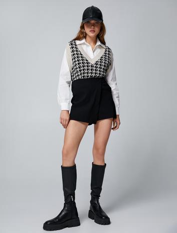 Mini Şort Yüksek Bel Fermuarlı Cep Detaylı Dokulu
