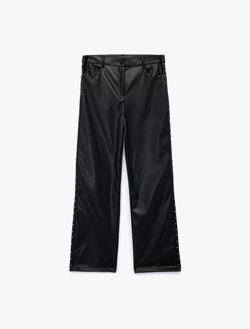 Normal Bel Düğmeli Cepli Metal Aksesuarlı Düz Paça Suni Deri Pantolon Sepete Ekle