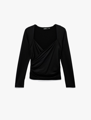 Uzun Kollu Slim Fit Kruvaze V Yaka Saten Bluz